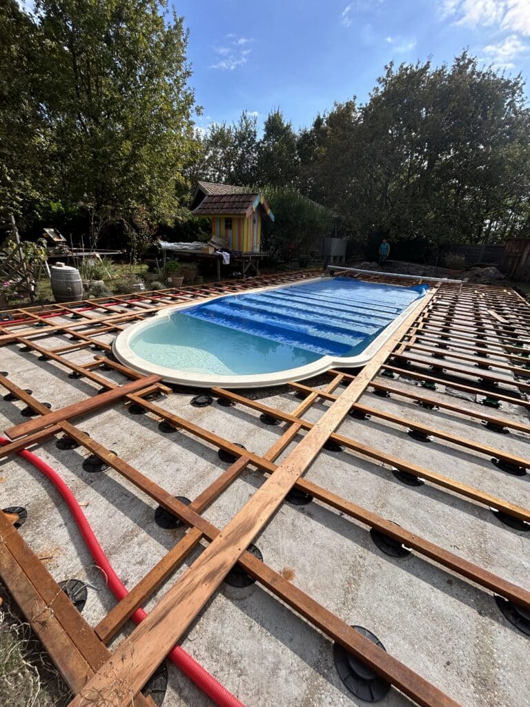La construction d’une terrasse en bois autour de votre piscine comprend plusieurs étapes clés : la préparation du sol, la pose de lambourdes en bois traité pour assurer une ossature stable, et l’installation des lames de terrasse qui peuvent être fixées avec des vis inox pour éviter la rouille. Le choix des lames peut varier en fonction du type de bois : lames pleines ou alvéolaires, finitions lisses ou antidérapantes pour plus de sécurité.